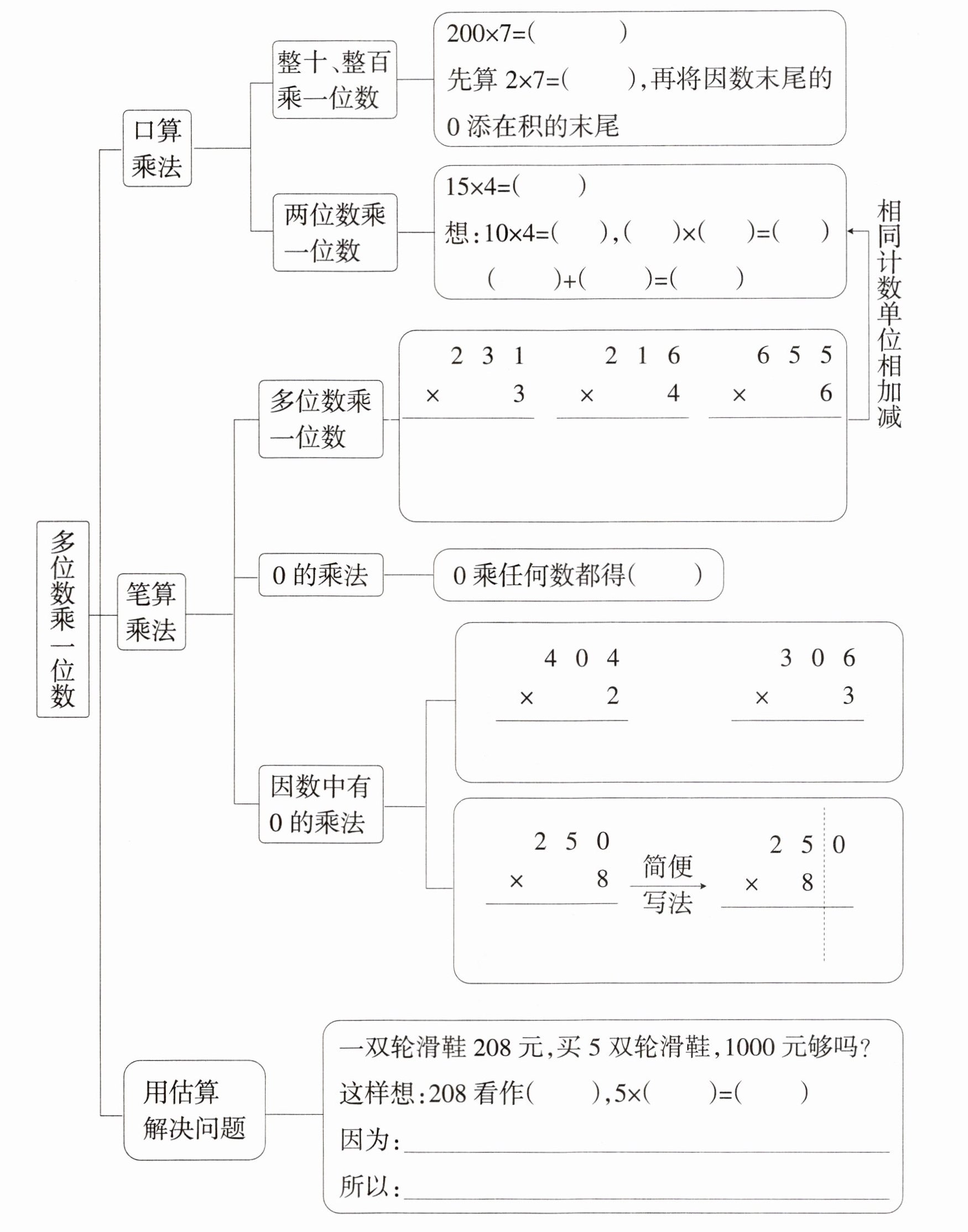 整十、整百乘一位数:1400,14两位数乘一位数:60,40,5,4,20,40,20,60多位数乘一位数:693,864,39300的乘法:0因数中有0的乘法:808,918,2000,2000用估算解决问题:200,200,1000,$208\gt200,$$5×208\gt1000,$不够。