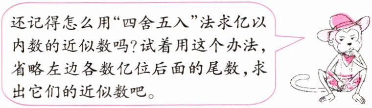 还记得怎么用“四舍五入”法求亿以内数的近似数吗?试着用这个办法,省略左边各数亿位后面的尾数,求出它们的近似数吧。