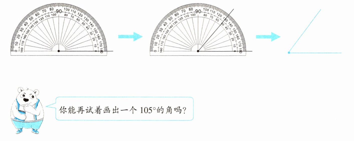 (若要画出105°的角,步骤同上,只是在量角器上找105°刻度线的地方点一个点,再完成后续操作)。