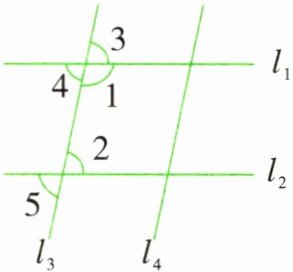 4. 如图,直线$l_1 // l_2$、$l_3 // l_4$,已知$\angle 1 + \angle 2 = 180°$,不测量,你能说明$\angle 2$、$\angle 3$、$\angle 4$、$\angle 5$的关系吗?