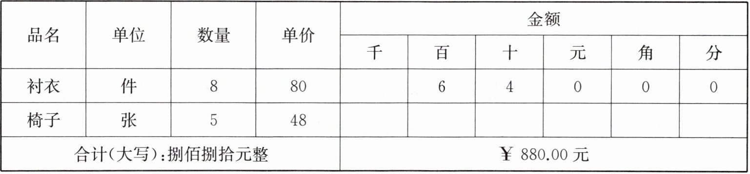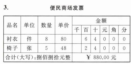 3. 重阳节那天,张叔叔去便民商场买了一些衬衣和椅子送给敬老院的爷爷和奶奶,你能把这张发票补充完整吗?