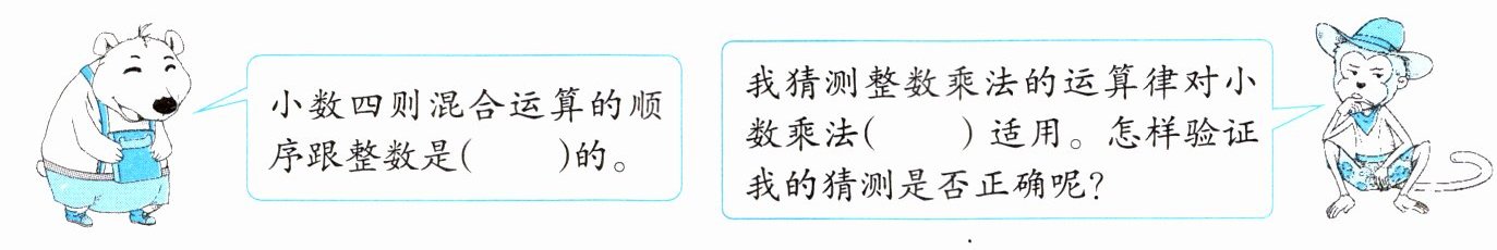 我猜测整数乘法的运算律对小数乘法( )适用。怎样验证我的猜测是否正确呢?