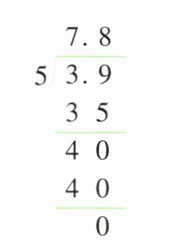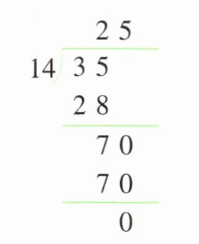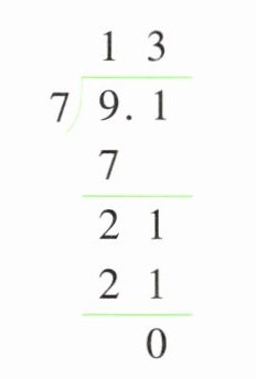 $\begin{array}{r}13\\7\enclose{longdiv}{9.1}\\7\quad\\\hline21\\21\\\hline0\end{array} $ $\begin{array}{r}25\\14\enclose{longdiv}{35}\\28\quad\\\hline70\\70\\\hline0\end{array} $ $\begin{array}{r}7.8\\5\enclose{longdiv}{3.9}\\35\quad\\\hline40\\40\\\hline0\end{array} $