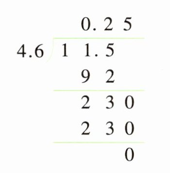 $\begin{array}{r}0.25\\4.6\enclose{longdiv}{11.5}\\92\\\hline230\\230\\\hline0\end{array} $