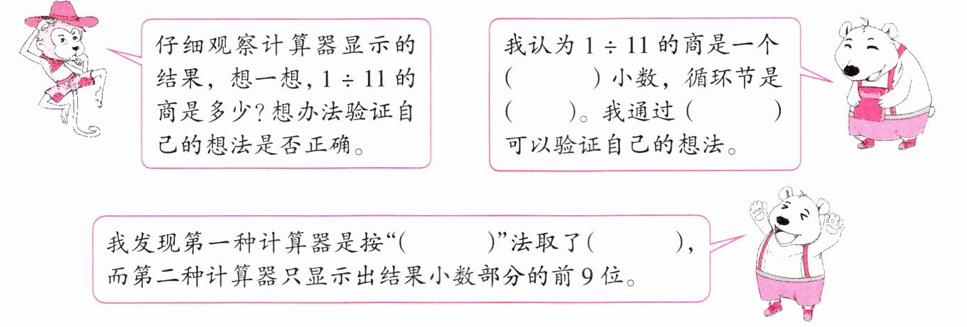 我认为$1÷11$的商是一个(循环)小数,循环节是(09)。我通过(继续用$1÷11$计算,结果一直是$0.0909\cdots$重复出现)可以验证自己的想法。