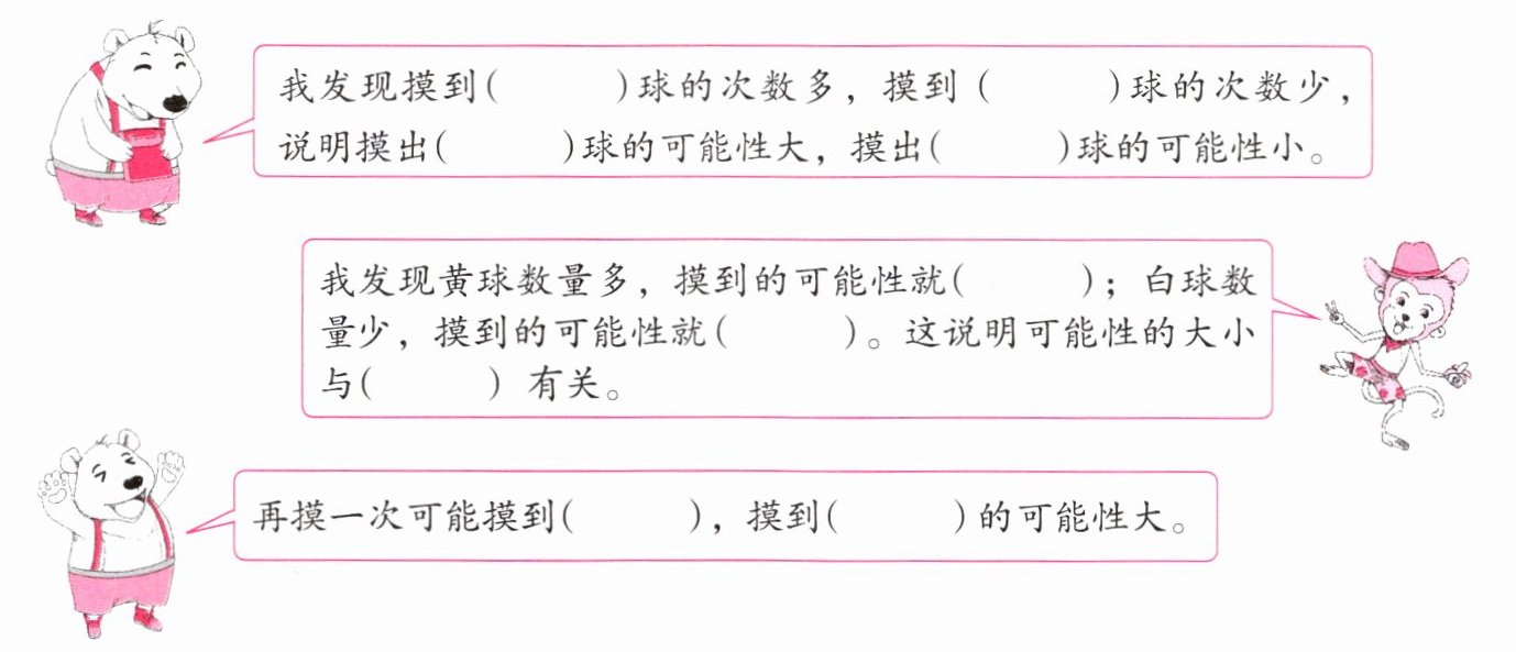 我发现摸到黄球的次数多,摸到白球的次数少,说明摸出黄球的可能性大,摸出白球的可能性小。我发现黄球数量多,摸到的可能性就大;白球数量少,摸到的可能性就小。这说明可能性的大小与数量有关。再摸一次可能摸到黄球,摸到黄球的可能性大。