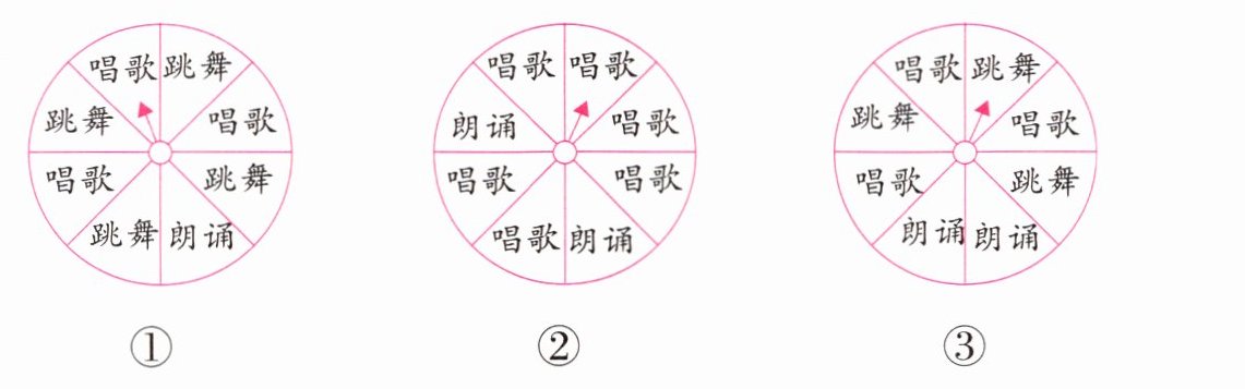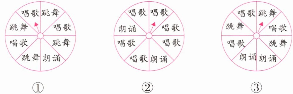 )号转盘指针转到唱歌和跳舞的可能性相等。(2) 小红喜欢唱歌,她应该选(