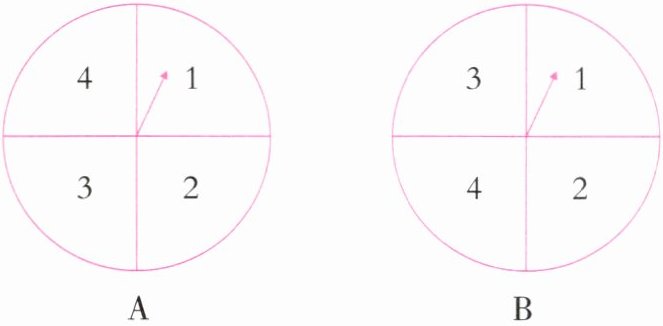 4. 明明和冬冬玩一种转盘游戏,设计了A、B两个完全相同的转盘(如下图),每个转盘被分成面积相等的四个区域,分别用数字1,2,3,4表示。固定指针,同时转动两个转盘,任其自由停止,若两个指针所指数字之积为单数,则明明获胜;若积为双数,则冬冬获胜;若指针指向分界线,则重新转动转盘。谁获胜的可能性大?说出理由。