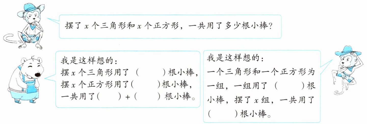 摆了 $ x $ 个三角形和 $ x $ 个正方形,一共用了多少根小棒?