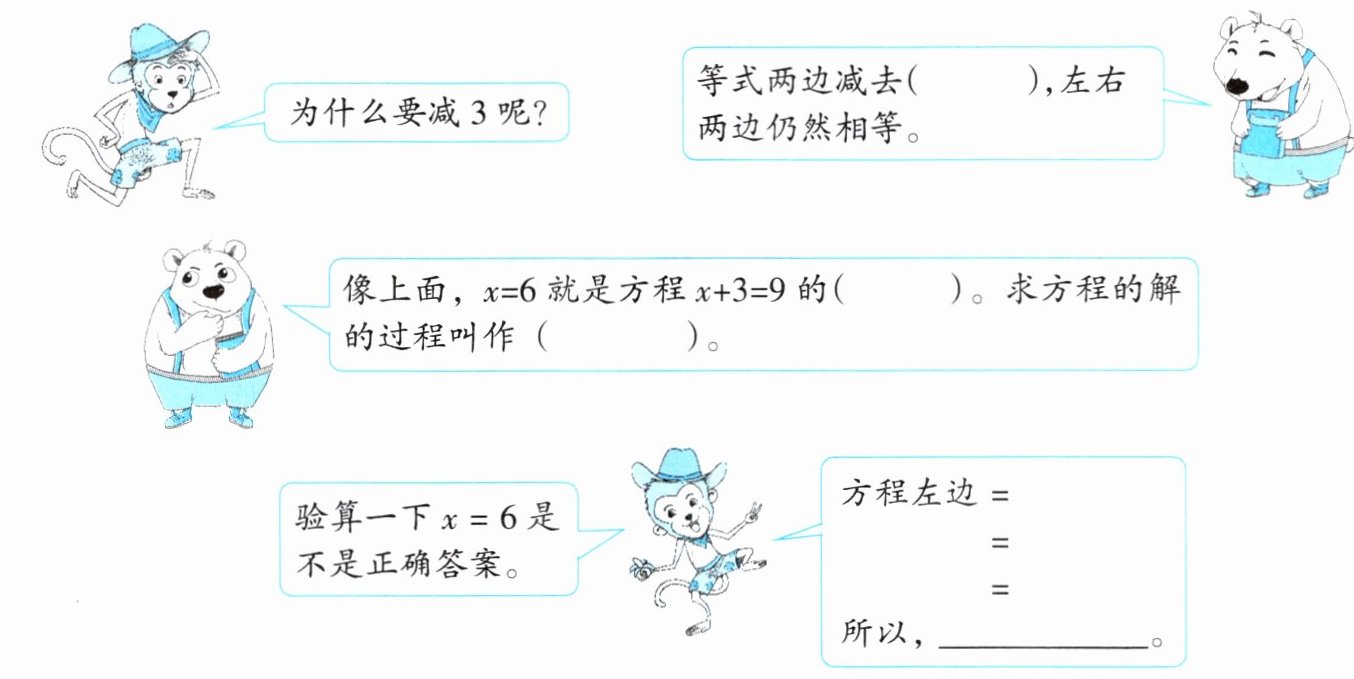 方程时,要注意养成检验的好习惯。使方程左右两边相等的未知数的值,叫做方程的解。求方程的解的过程叫做
