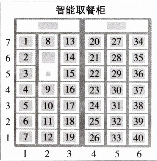 (2)玲玲取餐时发现要取的外卖所在的位置用数对表示是(5,4),她的外卖在(30)号柜。