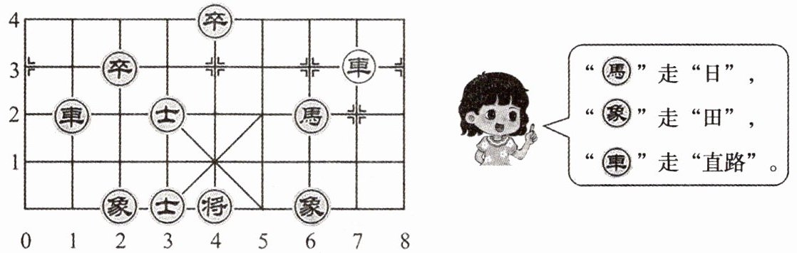 (3)根据中国象棋的规则,上图中的“馬”若向左边走一步,到达的位置可能是哪里?请将可能到达的位置用数对全部表示出来。