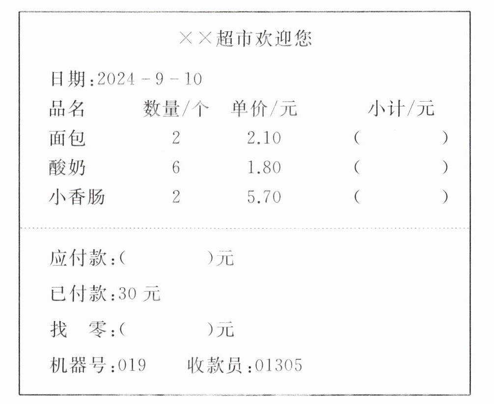 7. 请你把下面这张购物小票填写完整。