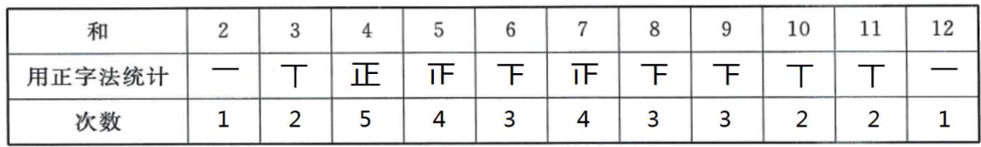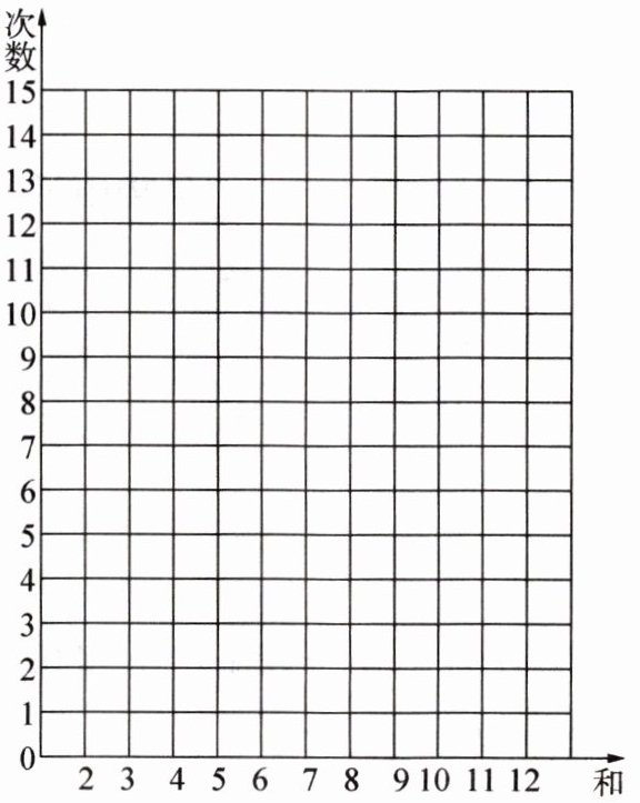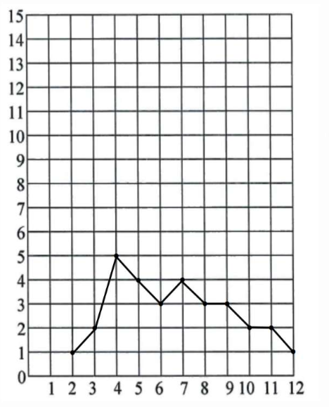 统计图根据上述统计表数据在对应和的数值上描点,高度对应次数(在和为2处高度为2,和为3处高度为2,和为4处高度为3,和为5处高度为5,和为6处高度为6,和为7处高度为7,和为8处高度为6,和为9处高度为5,和为10处高度为5,和为11处高度为2,和为12处高度为1)。