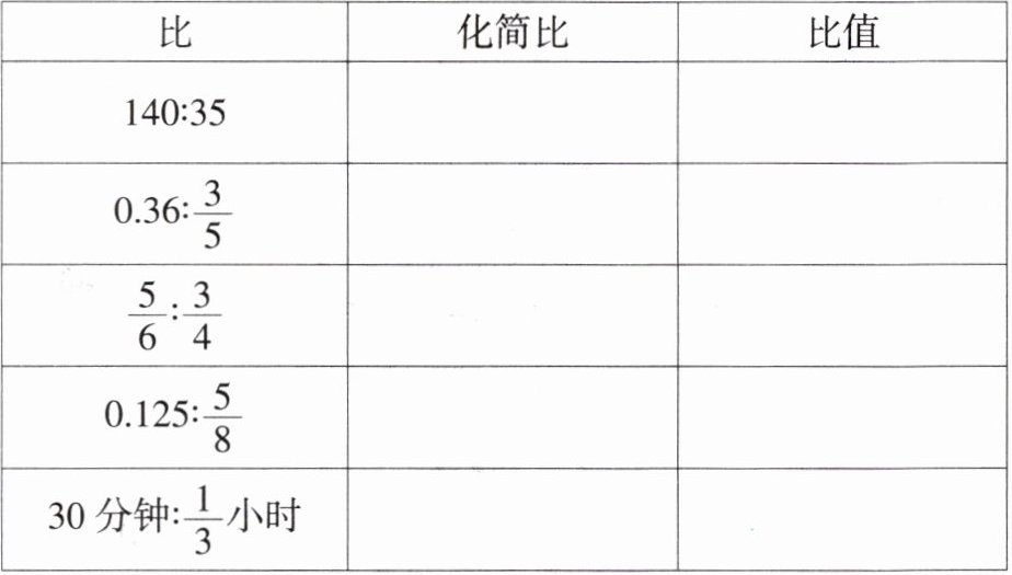 比 化简比 比值 140:35 4:1 4 0.36:$\frac{3}{5}$ 3:5 $\frac{3}{5}$ $\frac{5}{6}:\frac{3}{4}$ 10:9 $\frac{10}{9}$ 0.125:$\frac{5}{8}$ 1:5 $\frac{1}{5}$ 30分钟:$\frac{1}{3}$小时 3:2 $\frac{3}{2}$