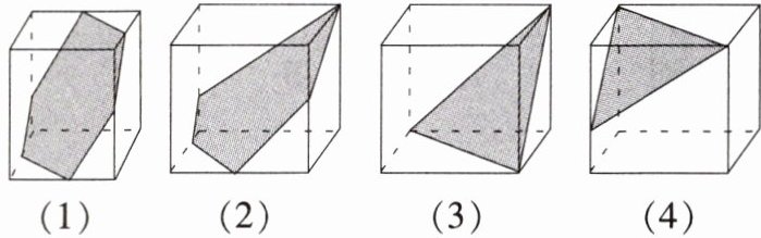按下列方式截正方体,能得到什么样的几何图形,请在图(5)中画出截面是梯形的示意图.
