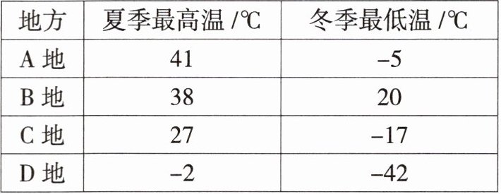 7. 科研所要大面积栽培某种植物,知道这种植物成活的主要条件是:该地四季的温差不得超过$20^{\circ}C$,若不考虑其他因素,下表中的4个地方哪个地方最适合这种植物的成活?
