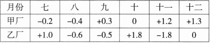 解:-0.2-0.4+0.3+0+1.2+1.3=+2.2(亿元),+1.0-0.6-0.5+1.8-1.8+0=-0.1(亿元).答:甲厂下半年赢利2.2亿元,乙厂下半年亏损0.1亿元.