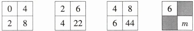 4. 填在下面各正方形中的四个数之间都有相同的规律,根据此规律,$m$的值是(