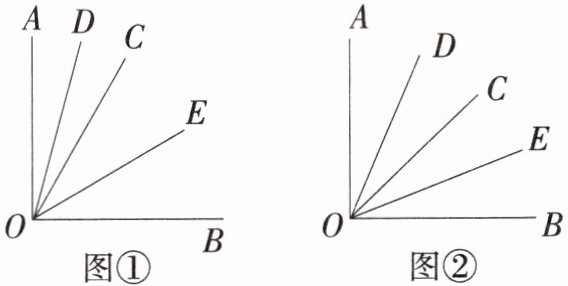 (2)如图②,当射线 $ OC $ 在 $ \angle AOB $ 内绕 $ O $ 点旋转时,$ \angle DOE $ 的大小是否发生变化?若变化,说明理由;若不变,求 $ \angle DOE $ 的度数。