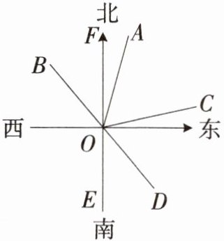 5. 如图,$ OA $ 的方向是北偏东 $ 15^{\circ} $,$ OB $ 的方向是西偏北 $ 50^{\circ} $,$ OD $ 是 $ OB $ 的反向延长线。