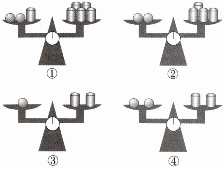 2. 如图,下列四个天平中,相同形状的物体的重量是相等的,其中第①个天平是平衡的,根据第①个天平,后三个天平中不平衡的有