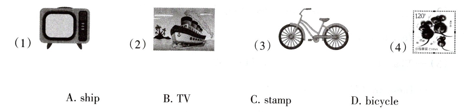 A. ship B. TV C. stamp D. bicycle