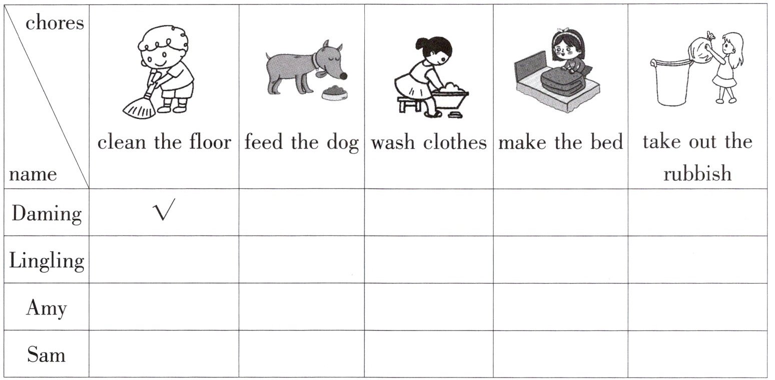 Hello, I'm Daming. In my class, all the students do chores at home. I often help clean the floor. Lingling often helps make the beds and wash clothes. Sometimes Amy's mum is busy. She needs to help mum wash clothes. And Sam can help take out the rubbish and feed his dog, Bobby. It is a cute dog. Everyone is helpful at home. They think chores are fun.