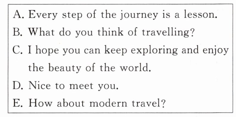 A: Nice to meet you, too. The landscape here is amazing. I love travelling just like you. I've read all your travel diaries. They make me want to see these amazing places myself! (2)