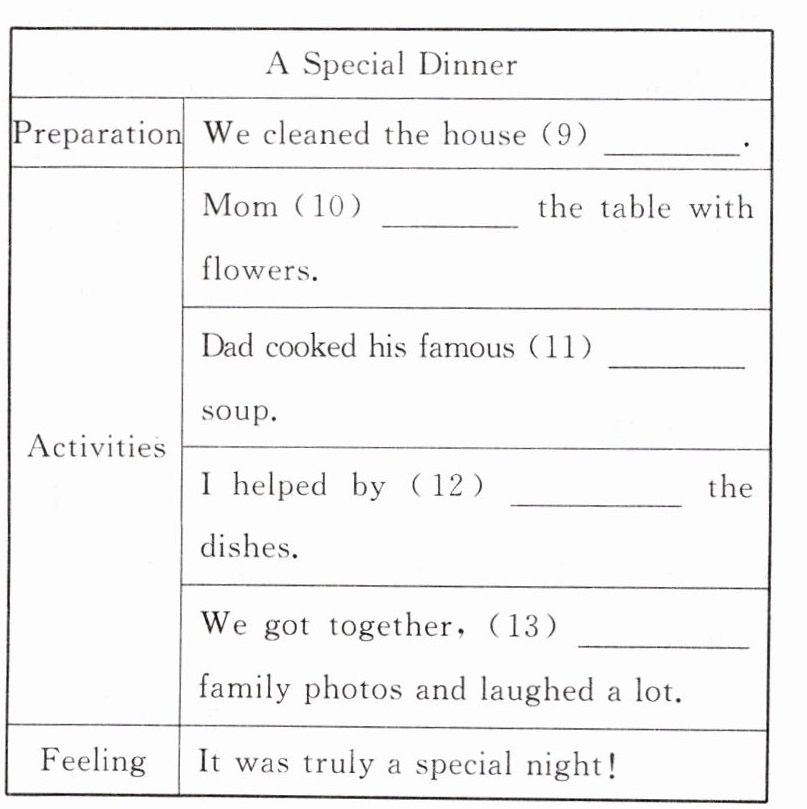 9. carefully 10. decorated 11. tomato 12. washing 13. shared