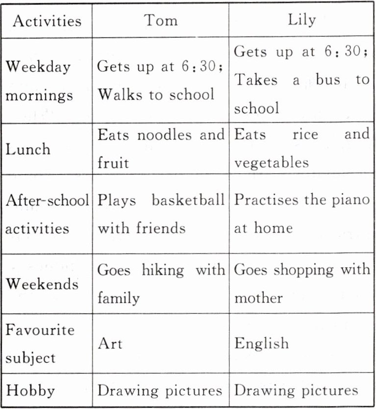 Tom and Lily are good friends. They study in the same school but different classes. Let's see their daily activities.