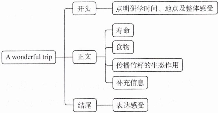 【写作指导】 一、研学游记; 记叙文+说明文; 一般现在时; 第一人称+第三人称 三、1. Sunday morning; visited 2. live up to 3. spend; eating 4. walk; helps; grow 5.(1)most popular animals (2)cute; like pink; black and white (3)in danger (4)protect; homes
