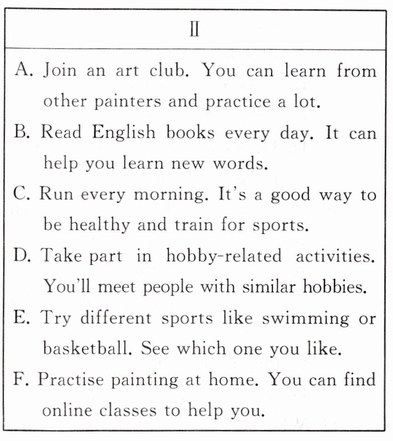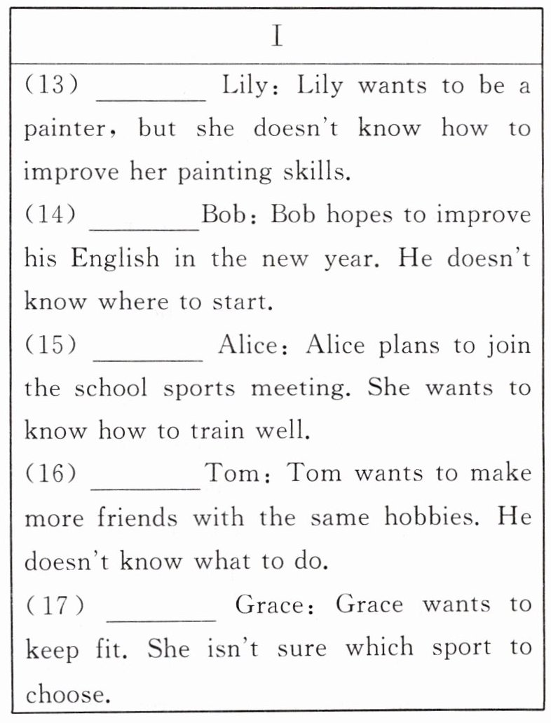 配对阅读。Ⅰ栏是五个同学关于未来计划的疑问,Ⅱ栏是七种相关的建议或信息。请为每个疑问匹配对应的内容。选项中有一项为多余项。