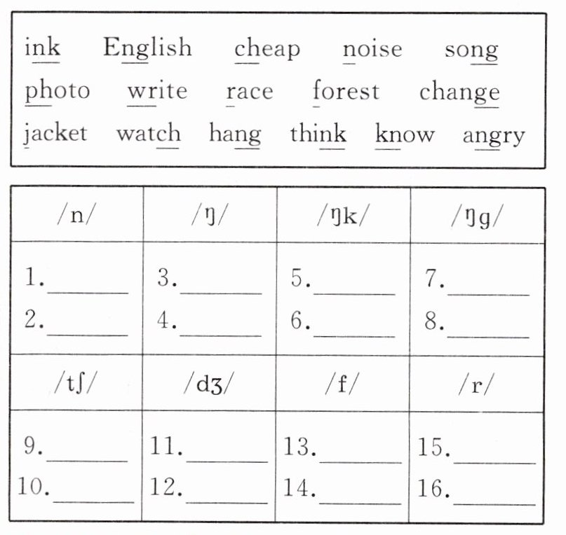 1. know 2. noise 3. song 4. hang 5. ink 6. think 7. angry 8. English 9. cheap 10. watch 11. jacket 12. change 13. photo 14. forest 15. race 16. write
