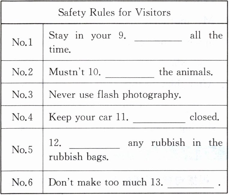9. car 10. feed 11. windows 12. Throw 13. noise
