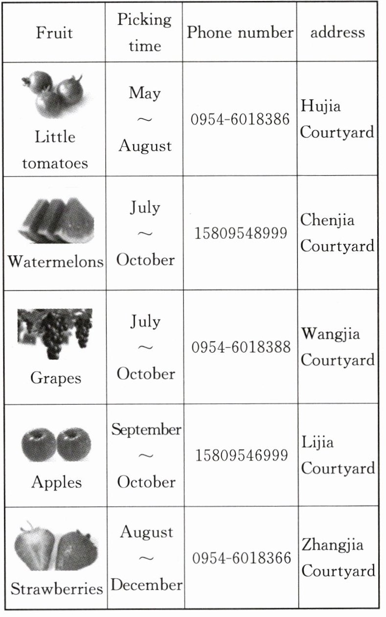 )27. What fruit can Li Qiang pick if he goes to Hujia Courtyard in June? A. Little tomatoes. B. Watermelons. C. Grapes. D. Apples.