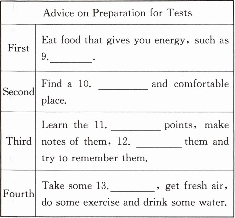 | Fourth | Take some 13.______, get fresh air, do some exercise and drink some water. |