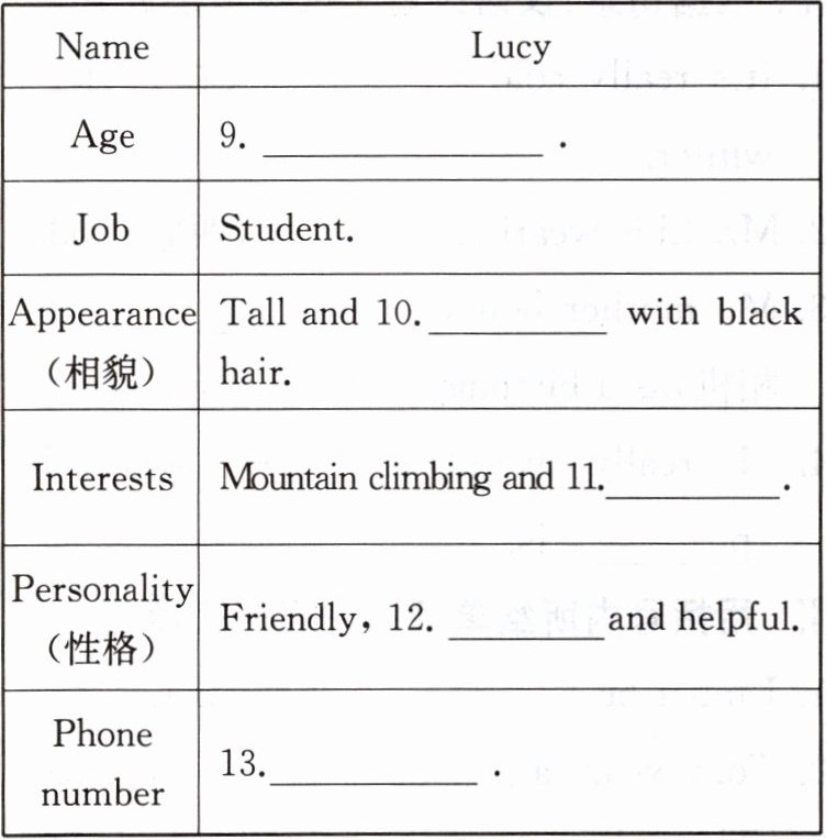 听短文,然后根据表格提示和所听内容完成下列各小题(每空1词)。在听该短文之前,你将有15秒钟的时间阅读表格中的内容。听完该短文后,你将有2分钟的时间检查答案,并将正确答案填入相应的空白处。