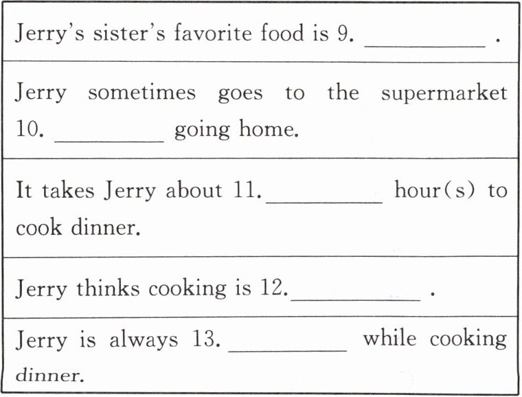 9. chicken 10. before 11. 1.5 12. interesting 13. singing