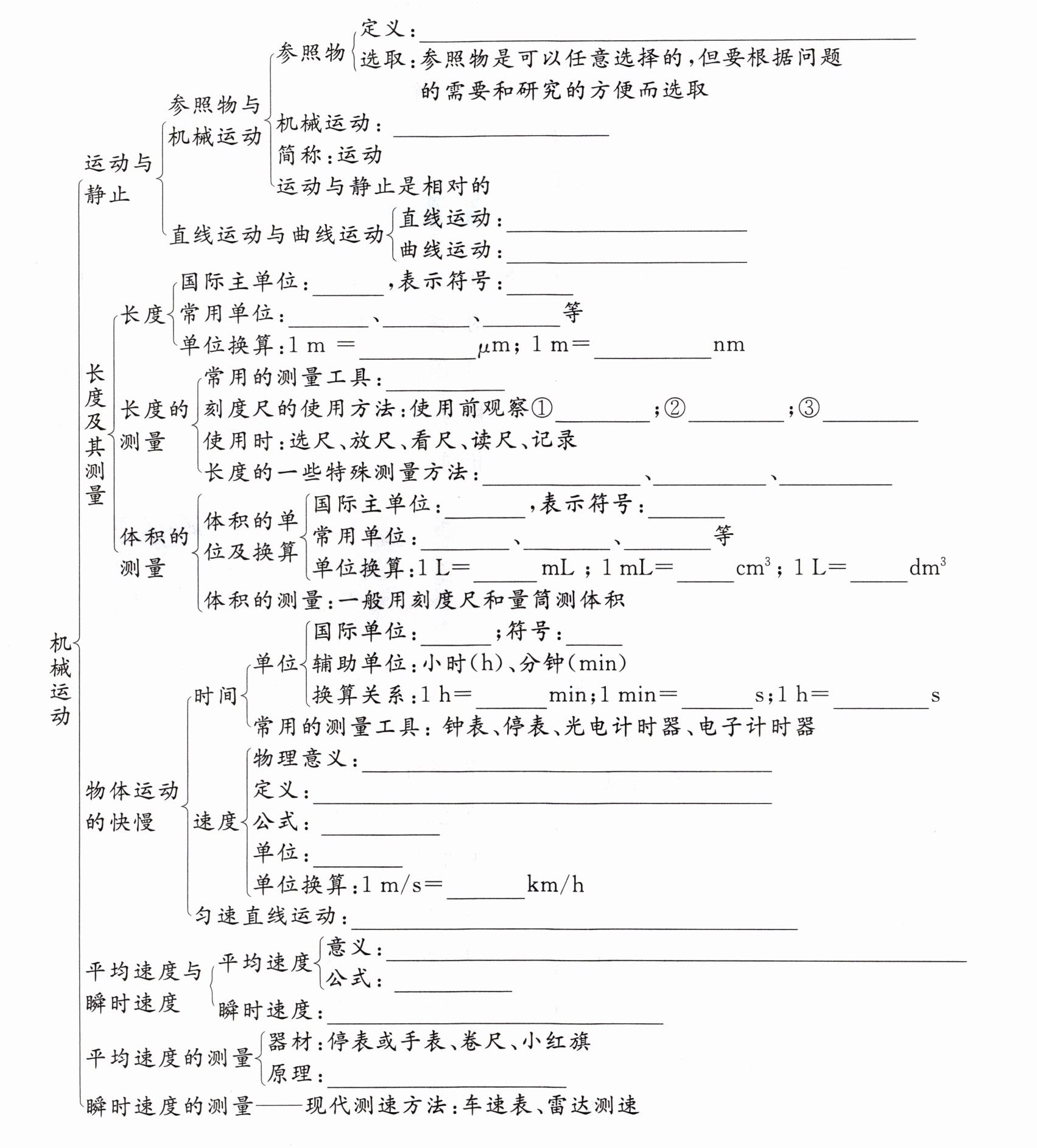 1. 在研究物体的运动时,选作标准的物体叫参照物 2. 物体位置的变化 3. 物体沿直线运动 4. 物体做非直线运动 5. 秒 s 6. 60 60 3600 7. 描述物体运动快慢的物理量 8. 物体在单位时间内通过的路程 9. v=s/t 10. m/s 11. 3.6 12. 物体沿直线运动,且速度大小保持不变 13. 表示运动物体在某一段路程内(或时间内)的快慢程度 14. v=s/t 15. 运动物体在某一瞬间的 16. 平均速度计算公式