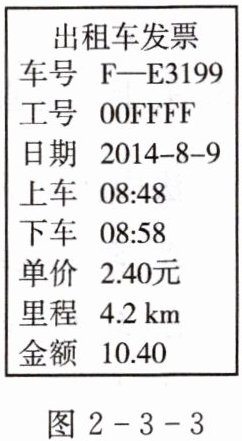 11. 某人乘坐出租车在平直的公路上匀速行驶。如图$2-3-3$所示,是他乘车到达目的地时的车费发票,请根据发票内容,求: