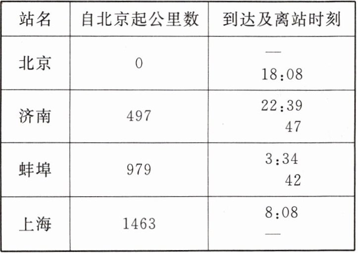 6. 下表为简化的北京至上海 $ T13 $ 次特快列车时刻表。请计算: