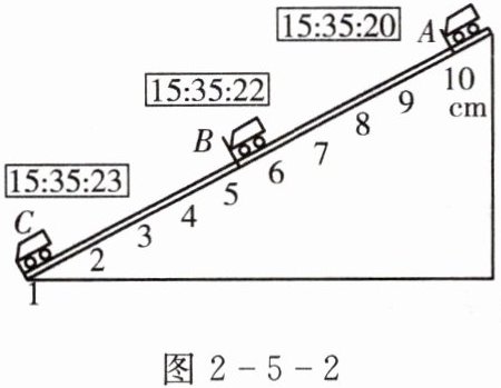 5. 小华用如图 $ 2 - 5 - 2 $ 所示的装置“测小车的平均速度”。小车从带刻度(分度值为 $ 1cm $)的斜面顶端由静止下滑,图中的数字是小车到达 $ A $,$ B $,$ C $ 三处时电子表的显示。