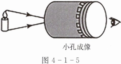 11. 小明做了个小实验,如图 4 - 1 - 5 所示,先用钉子在易拉罐底部的中央敲一个小孔,再将易拉罐的顶部剪去后,蒙上一层塑料薄膜,制成一个针孔照相机。将点燃的蜡烛置于小孔前的适当位置,观察并研究小孔成像的特点: