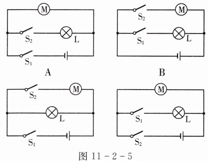 6. LED多功能充电风扇有两个开关,其中开关$S_{1}$只控制应急照明LED灯$L$,$S_{2}只控制电风扇M$,在如图11-2-5所示的四个电路中,符合上述要求的是(