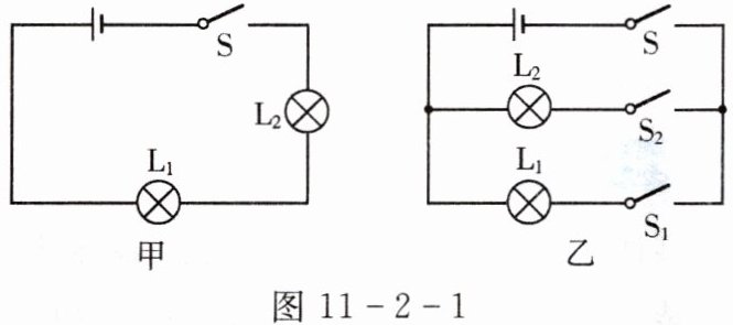 1. 如图11-2-1所示,甲图灯泡$L_{1}和L_{2}$的连接方式是