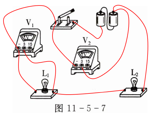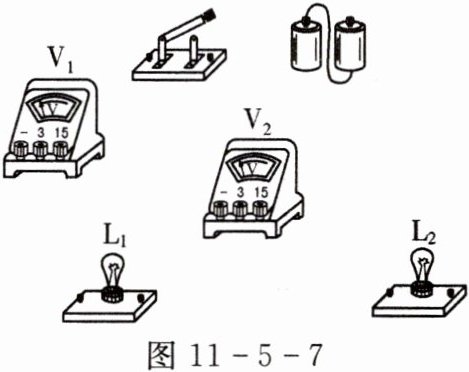 11. 按要求连接如图 11 - 5 - 7 所示实物图。要求:电灯$ L_1、$$L_2$串联,电压表$ V_1$测量灯$ L_1$两端的电压,电压表$ V_2$测量电源两端的电压。并按连接好的实物图在虚线框中画出相应的电路图。