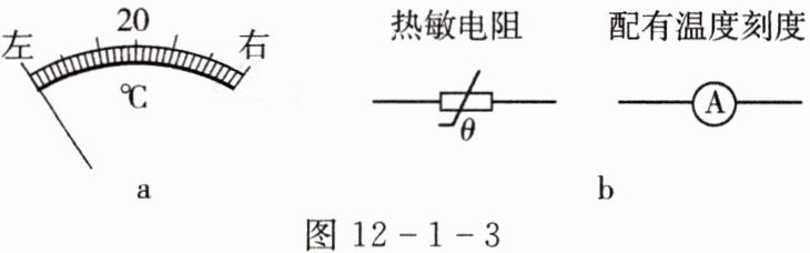 (选填“大”或“小”)。(2)在上述电路中,我们将电流表中的电流刻度换成相应的温度刻度,就能直接显示出热敏电阻附近的温度。如果刻度盘正中的温度刻度值为$20\ {^{\circ}C}$(如图 12 - 1 - 3a 所示),则$25\ {^{\circ}C}的刻度应在20\ {^{\circ}C}$的