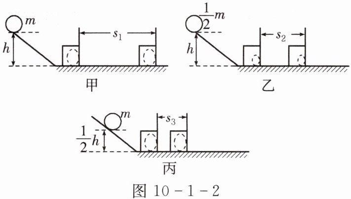 16. 小丽同学设计了如图 10 - 1 - 2 所示的探究“物体动能的大小与哪些因素有关”的实验,让铁球从同一斜面上某处由静止开始向下运动,然后与放在水平面上的纸盒相碰,铁球与纸盒在水平面上共同移动一段距离后静止。