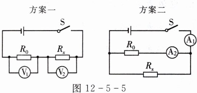 ①方案一的电路中,闭合开关 S,如果电压表 $ V_1 $ 和 $ V_2 $ 的读数分别为 $ U_1 $ 和 $ U_2 $,则电阻 $ R_x $ 的阻值表达式为 $ R_x = $